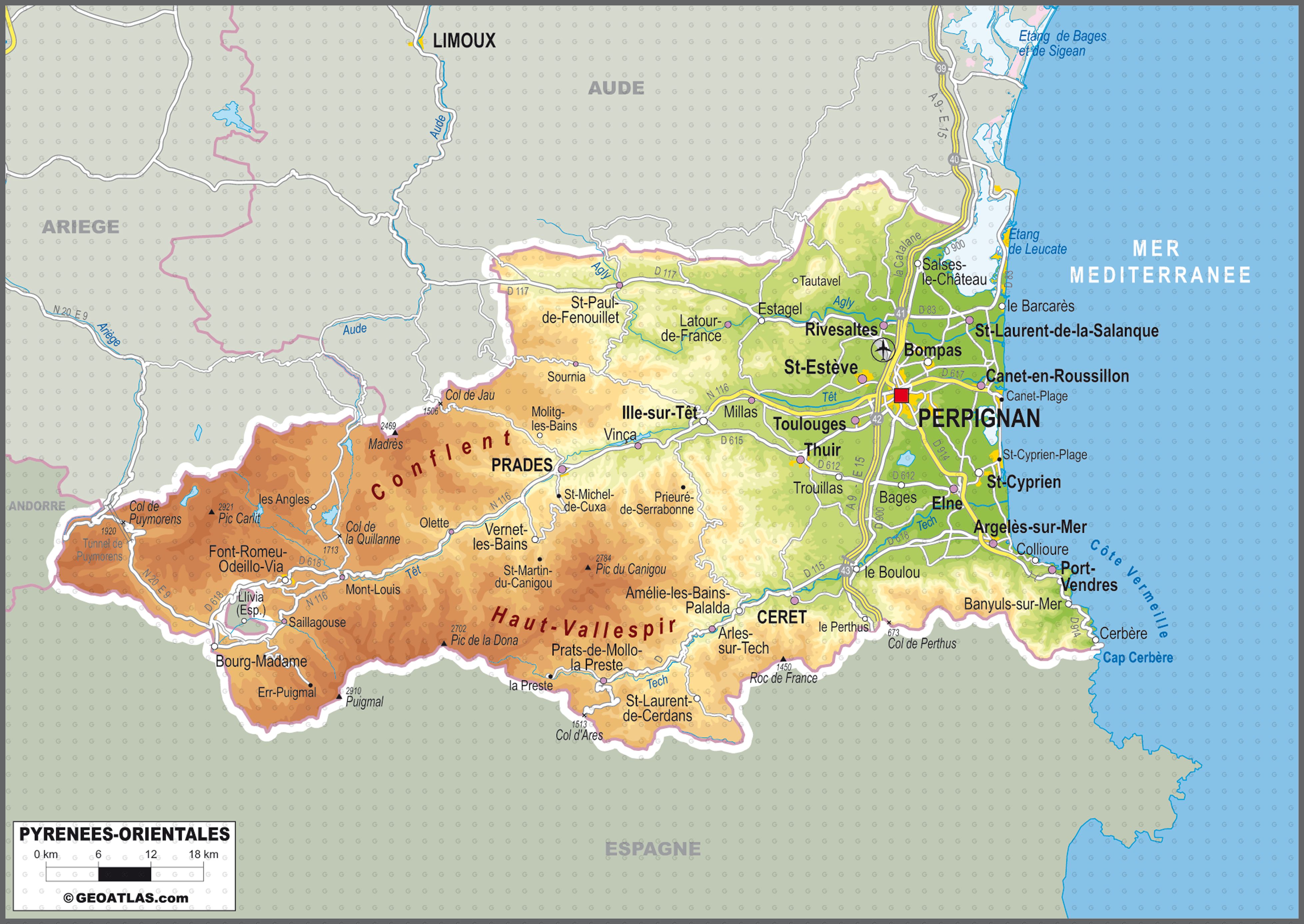 Localisation. Le département des Pyrénées-Orientales fait partie de la région Occitanie.Ses frontières sont constituées de la mer Méditerranée à l'est, l'Espagne (Catalogne, province de Gérone) au sud, du département de l'Aude au nord, de l'Andorre et du département de l'Ariège à l'ouest.. Il fait partie des rares départements français (avec les Alpes-Maritimes, les Pyrénées.