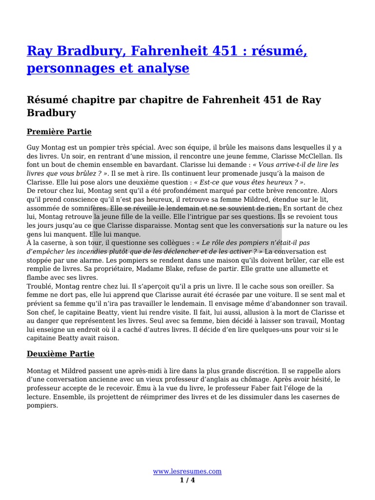 Ray Bradbury, Fahrenheit 451 : résumé, personnages et analyse Résumé chapitre par chapitre de Fahrenheit 451 de Ray Bradbury Première Partie Guy Montag est un pompier très spécial. Avec son équipe, il brûle les maisons dans lesquelles il y a des livres. Un soir, en rentrant d'une mission, il rencontre une jeune femme, Clarisse McClellan.
