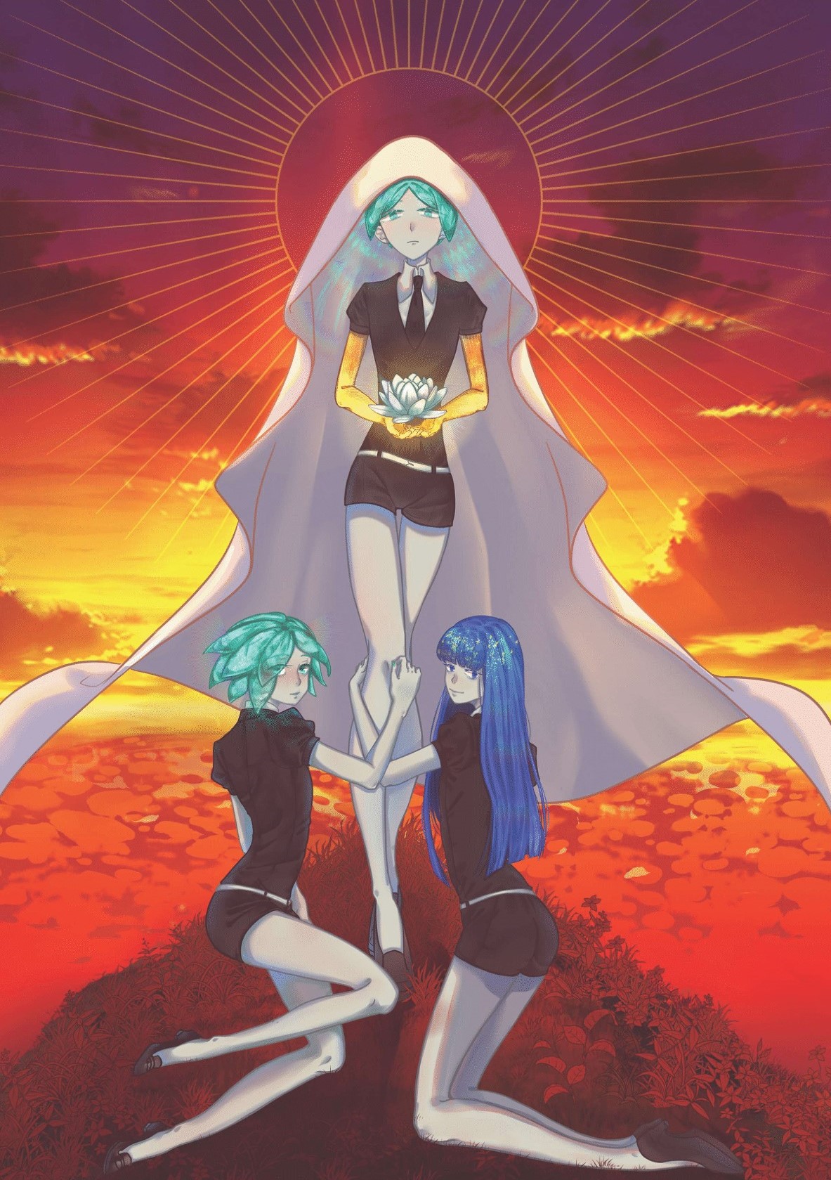 In the distant future, a new life form called The Lustrous are born. The 28 Lustrous must fight against the Lunarians who want to attack them and turn them into decorations, thus each Lustrous is assigned a role such as a fighter or a medic. Though they hope to fight the Lunarians, Phos is a Lustrous who is given no assignment until the Lustrous' master Adamantine asks them to write an.
