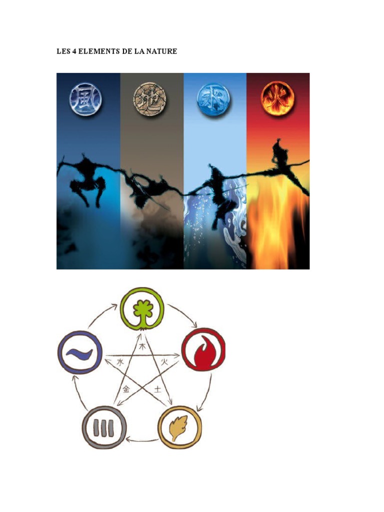 Tous les éléments sont complémentaires, pas un ne domine l'autre et ils doivent être équilibrés. Le vent peut éteindre le feu mais aussi attiser les flammes d'une forêt. L'eau peut éteindre le feu, et le feu faire bouillir l'eau.La terre peut aussi éteindre le feu s'il est petit. L'eau et la terre forment la boue, s'il y a trop de boue c'est déséquilibré.