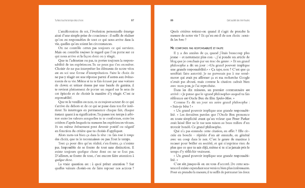 L'art subtil de s'en foutre : Un guide à contre-courant pour être soi-même par Mark Manson aux éditions Eyrolles. Un livre de développement personnel pour ceux qui détestent le développement personnel Le discours ambiant nous pousse sans cesse à nous améliorer. Sois plus he