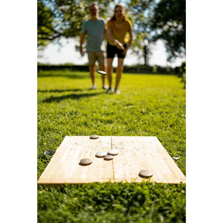 Palet breton CONTENU: • 1 Plateau de jeu en bois de peuplier de 70 * 70 cm • 12 Palets et 1 maître en fonte • 1 règle du jeu PRINCIPE DU JEU : Pour jouer seul ou en équipe. Le but du jeu est de lancer les palets le plus près possibles du maître, sur la planche.