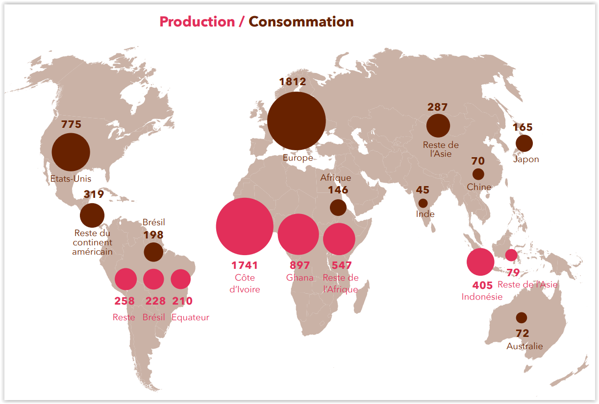 Production de Cacao, chiffres clés 2020 5 millions de producteurs au Sud produisent 4,5 millions de tonnes de cacao. Les cacaoyères couvrent plus de 8 millions d'hectares. Les rendements varient de 150 à 2 500 kg/ha/an. La consommation aura augmenté de 20 % en 2020-2025. La Côte d'Ivoire produit 43 % du cacao mondial. 4 pays africains en fournissent plus de 70 % des fèves de cacao.